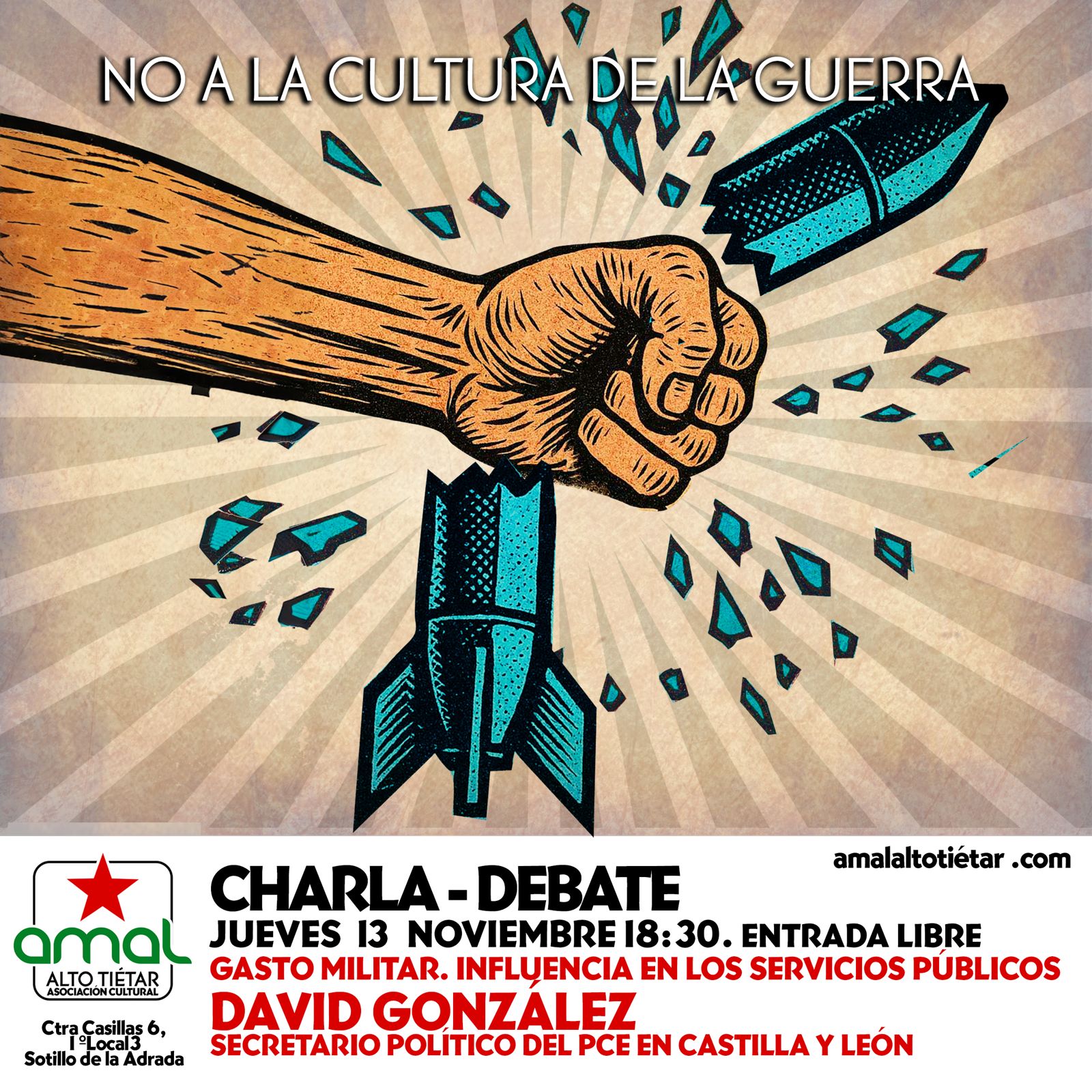 Desde la asociación "Amal - Alto Tietar" nos invitan a participar en la charla "Gasto militar: Influencia en los servicios públicos" este jueves 13 de noviembre a las 18:30h en Carretera Casillas 6, 1º Local 3, Sotillo de Adrada, Ávila.