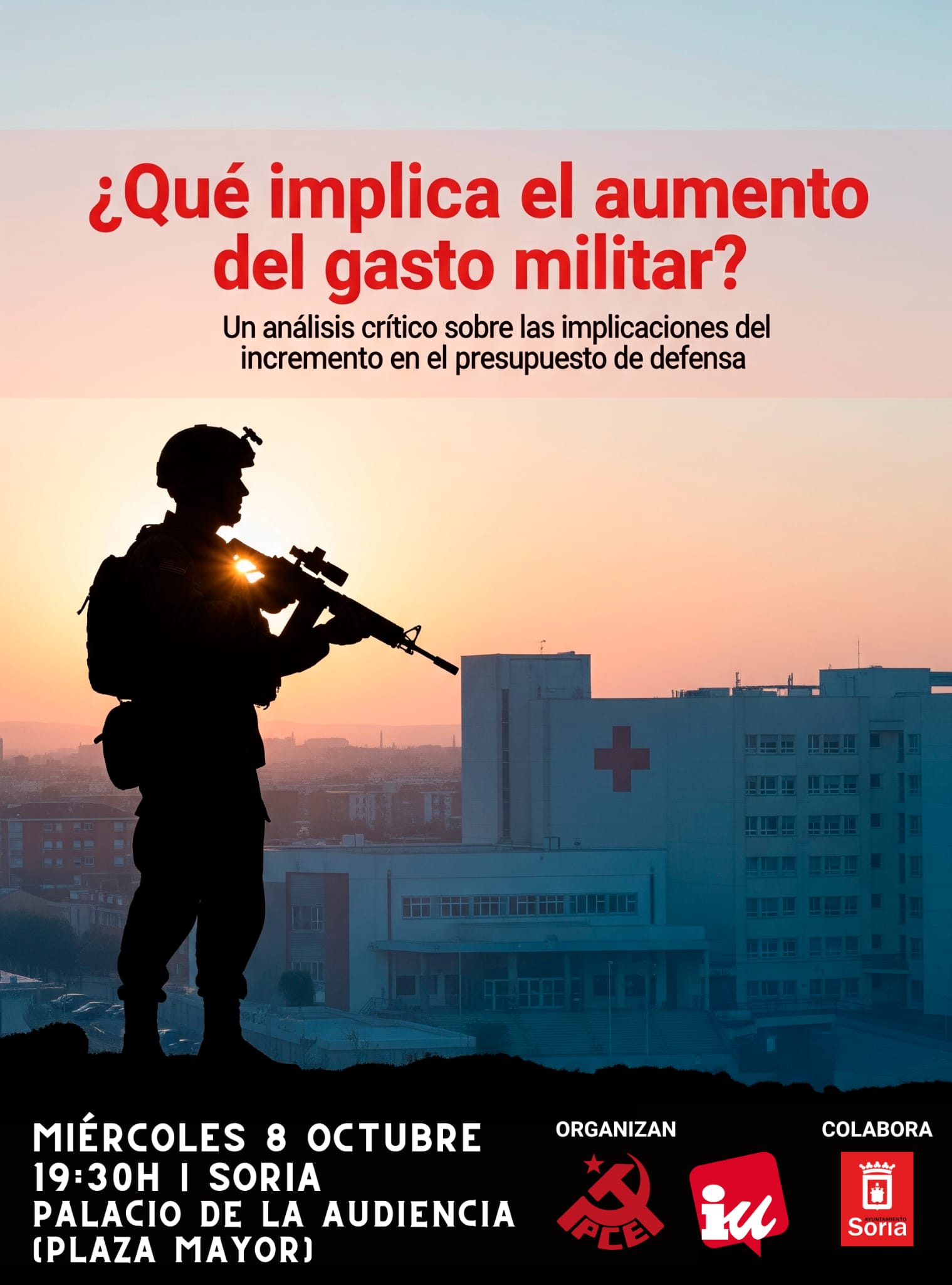 Soria, 4 de octubre de 2025 - El Partido Comunista de España (PCE) en Soria invita a todos los ciudadanos y ciudadanas a la charla-coloquio titulada "¿Qué implica el aumento del gasto militar?". El acto tendrá lugar el próximo miércoles, 8 de octubre de 2025, a las 19:30 horas en el Palacio de la Audiencia, situado en la Plaza Mayor de Soria.