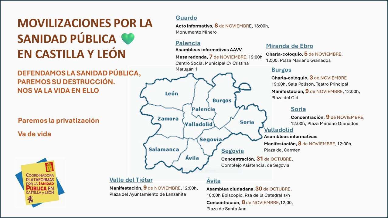 Resignarse no es una opción. Por eso nos movilizamos una vez más en Burgos y en Castilla y León. Queremos exponer a las autoridades sanitarias nuestras reivindicaciones y exigir que se respete nuestro derecho a una sanidad pública, gratuita, universal y de calidad, y que las externalizaciones sean excepcionales y transitorias.