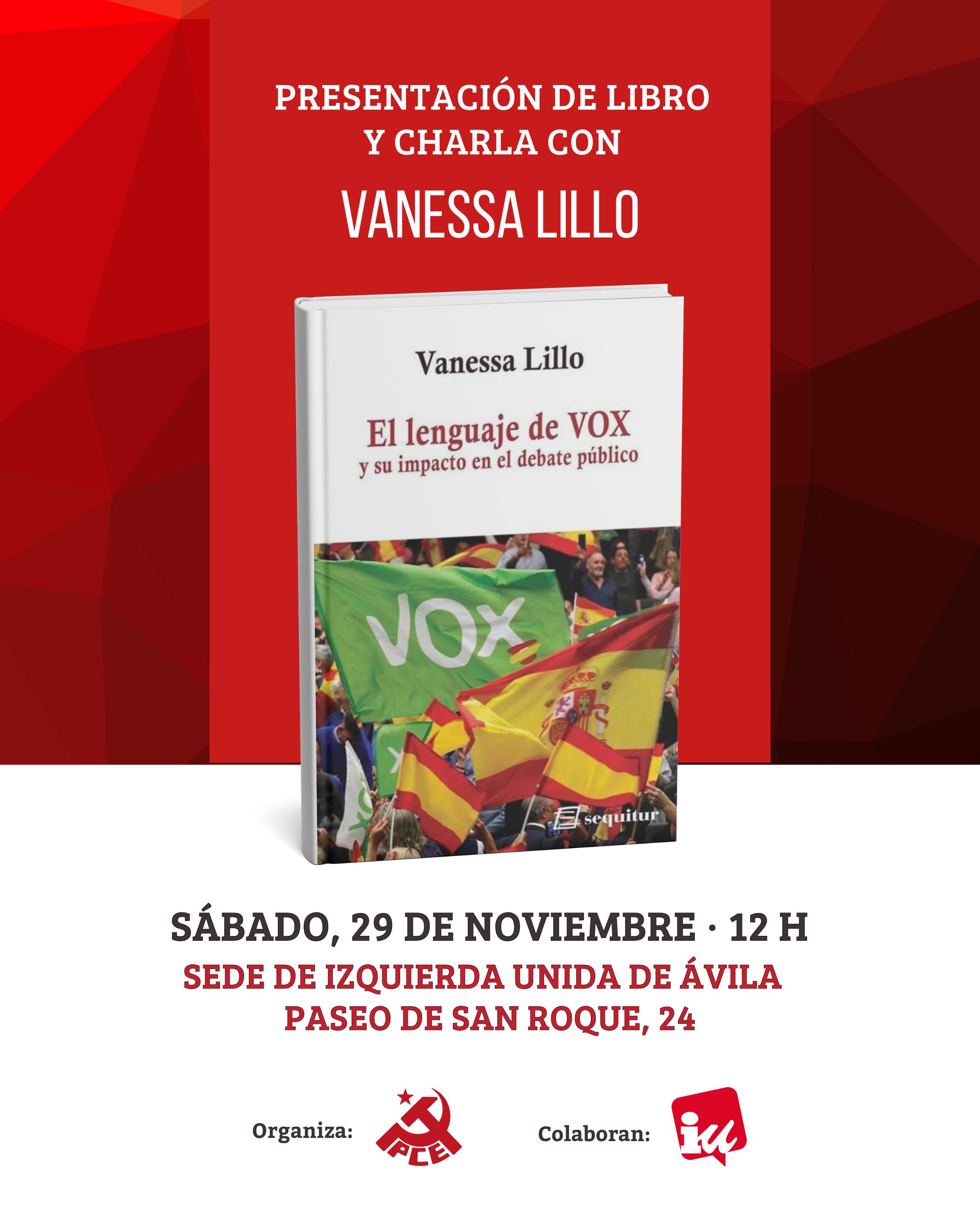 El Partido Comunista de España (PCE) junto a Izquierda Unida, organiza la presentación del libro "El lenguaje de Vox y su impacto en el debate público" (Editorial Atrapasueños). El evento se celebrará el próximo sábado, 29 de noviembre, a las 12:00 horas en la sede de Izquirda Unida / PCE en Ávila (Paseo de San Roque, 24).