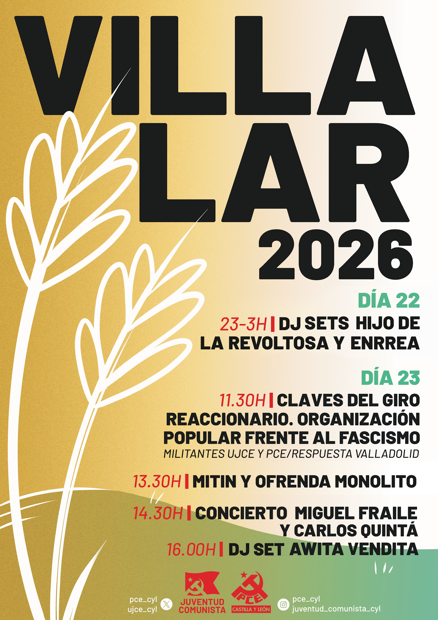 La carpa de PCE-UJCE abrirá no solo el jueves 23 sino también el martes 22 por la tarde-noche, y contaremos con una programación amplia y diversa, incluyendo charlas, actuaciones musicales y, por supuesto, barra y cocina. Además, dispondremos de un punto de venta de artículos originales diseñados especialmente para Villalar 2026.